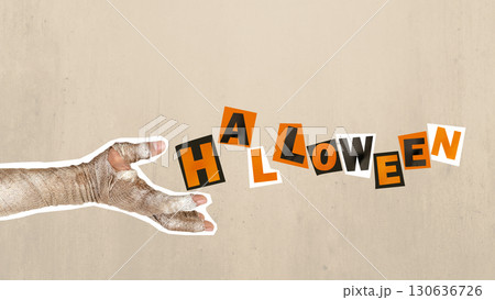 Mummy hand with dirty bandages on them showing text of Halloween on a colored background. Mummy, devil, evil, satan, or zombie hand. Collage art of Halloween