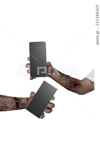 The zombies hand with wounds and blood holding a cellphone isolated over a white background. Zombie, devil, evil, satan, or monster hand. Mockup or Copy space. Concept of Halloween or Horror