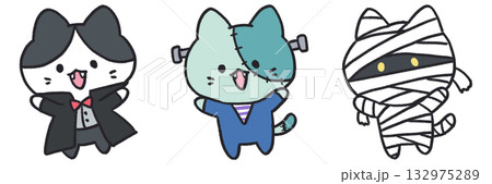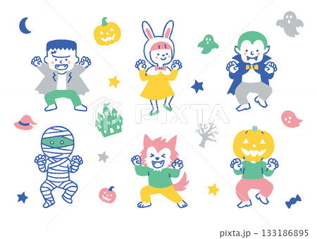 Cartoon monster group skeleton pumpkin vampire Frankenstein witch playful Halloween