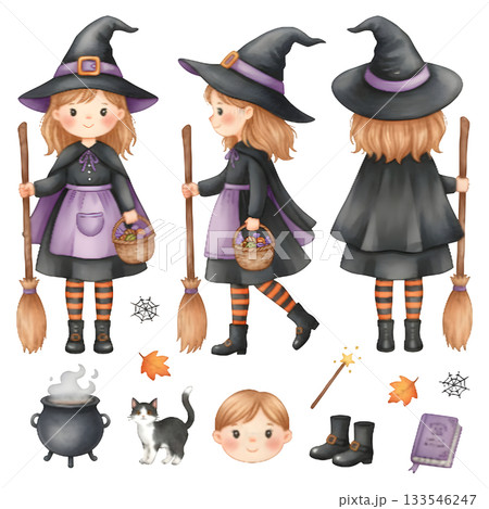 Halloween which character set. character constructor for animation. Front, side and back view set. Body parts, postures, poses collection. Watercolour illustration design.