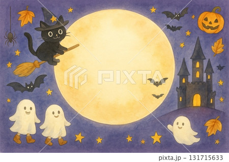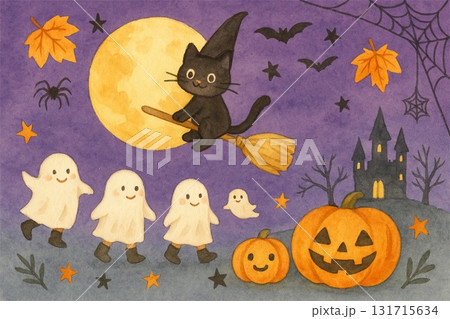 一幅可愛的萬聖節水彩畫,描繪了一隻女巫貓和鬼魂在滿月之夜飛翔