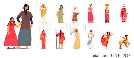 Set Female Characters Wearing Historical Costumes. Women Indian Dancer, Medieval Peasant, African, Victorian Lady
