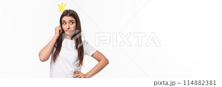 Entertainment, fun and holidays concept. Portrait of sassy and classy good-looking girl in t-shirt, holding carnaval stick with crown, acting like queen or super star, standing white background