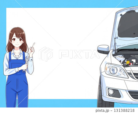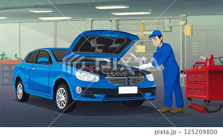 一輛經過保養的像素化汽車。一位專業機械師和一輛紅色經典車。