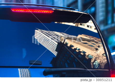 USA, New York State, New York City, Buildings reflecting in windows of suv
