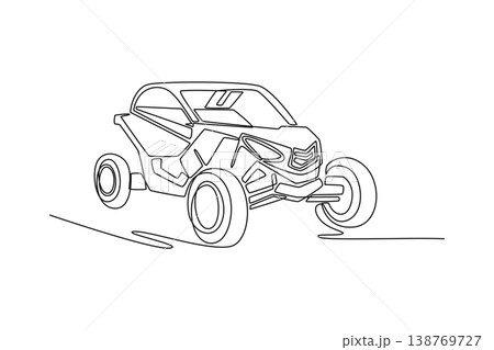 Single continuous line drawing off-road buggy or side-by-side vehicle, desert racing trail exploration. High-energy motor sport branding and adventure. One line draw graphic design vector illustration