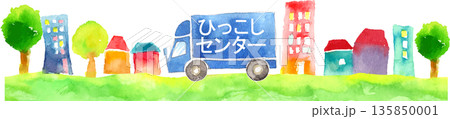 水彩風格的城鎮景觀插圖,中心貨車正在行駛 - 向量圖