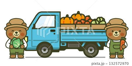 兩隻農夫熊和一輛裝載著收穫的捲心菜和胡蘿蔔的輕型卡車的插圖(耕作、收穫、可愛動物)