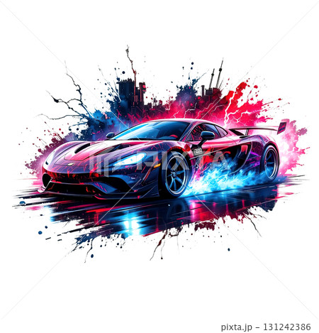 High-speed sports car racing illustration with neon red and blue accents, fire, and electric, gritty cityscape paint splatters.