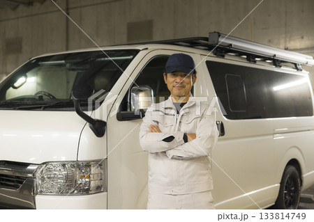 輕型貨堆和穿著工作服的中年男性商務人士