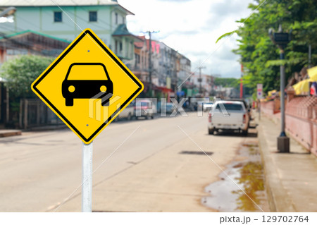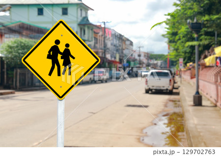 Yellow Pedestrian School Crossing Sign with Blurred Street