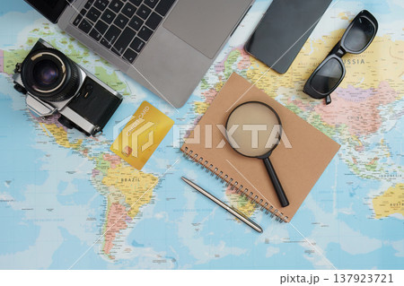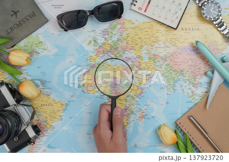 Travel Planning. Close-up of a map with a passport and magnifying glass.