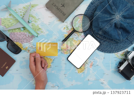 Top view of debit or credit card with green umbrella and green signboard of a worldwide map on a white background. Mockup or template. Flat lay. Concept of Security, finance, and business