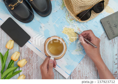 Travel composition with notepad, globe, camera and coffee cup, top view.