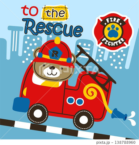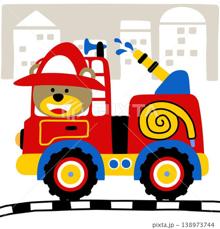 Vector cartoon of cute bear driving fire truck on buildings background