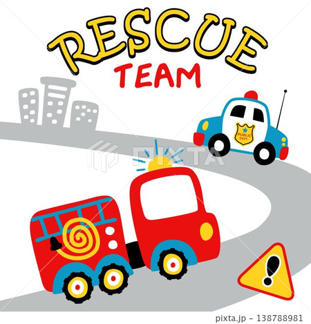 Rescue vehicle team in city road, vector cartoon illustration