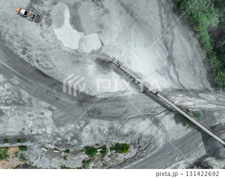 Aerial view of granite and limestone crushing plant with dump trucks and excavators processing raw stone into construction aggregates for concrete and infrastructure development. Stone mill factory.