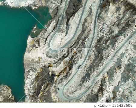 Open pit mine industry. Limestone quarry with truck. Heavy machinery in mining industry and construction material supply. Landscape of resource extraction in industrial site. Turquoise water lake.
