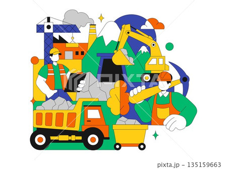 Mining Company Vector Illustration Featuring Heavy Yellow Dumper Trucks for Industrial Sand Mining Process or Transportation in a Flat Background