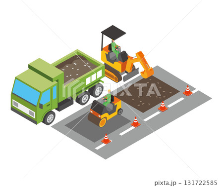 移動挖土機的工人的等距向量圖素材