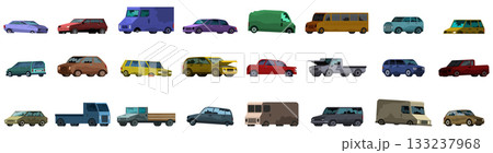 Abandoned broken car icon set. Large set of various cars and trucks driving on white background