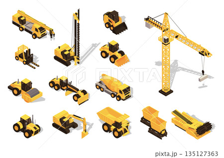 Construction equipment 3d isometric mega set in flat design. Collection isometry elements of trucks, bulldozers, concrete mixer, tractors, backhoes, forklifts, other machinery. Vector illustration.