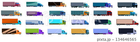 Truck semi-trailer icons set. Collection of colorful delivery trucks transporting goods