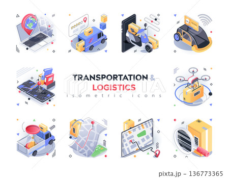 Transportation and logistics concept isometric 3d icons set. Global distribution, trucking, package tracking applications, warehouses, fast shipping, isometry isolated collection. Vector illustration