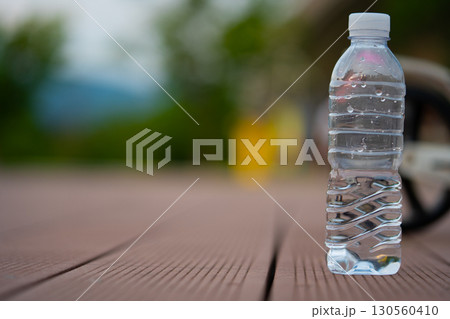A bottle of clean water and a scooter wheel. After exercise on a summer evening.