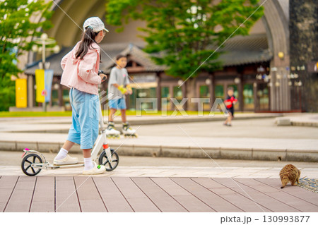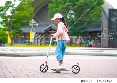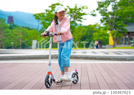 Asian girl is going to ride a scooter. Meerkat. Copy space