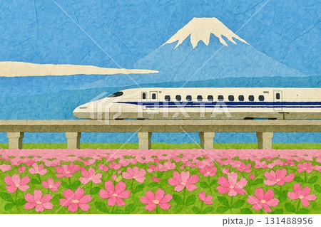 子彈列車、新鮮綠色植物和富士山的水彩畫