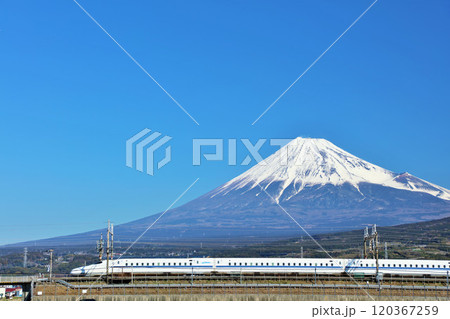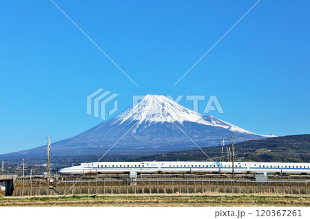 東海道新幹線 N700 系列穿越富士河大橋,背景為富士山