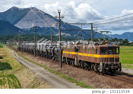 一列由EF64型電力機車牽引的運油列車在南阿爾卑斯山的映襯下全速行駛。
