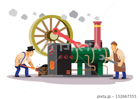 Age of industrial Revolution . People working on steam engines . Cartoon character illustration . Isolated white background . Vector .