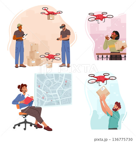 Set Drones Delivery Service, Technology Of Air Transportation Goods To Customers. Fast, Efficient Alternative