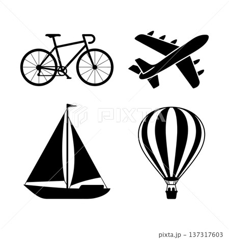 transportation theme silhouette set with bicycle, airplane, sailboat, and hot air balloon with basket