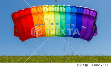 Rainbow colored parachute canopy with geometric grid pattern landing on green grass field against clear blue sky