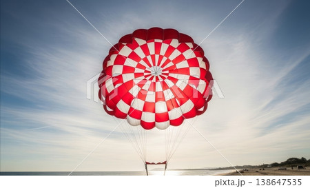 Red and white striped parasailing parachute against blue sky over tropical beach coastline during daytime water sports activity