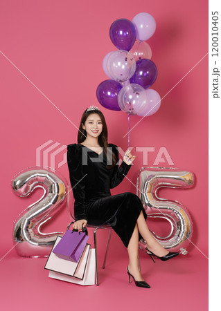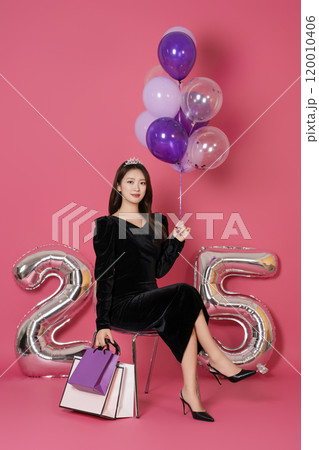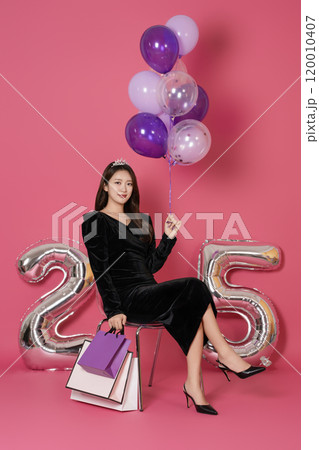 A woman in her 20s sitting and posing with a balloon and a shopping bag in front of a 25 number balloon.