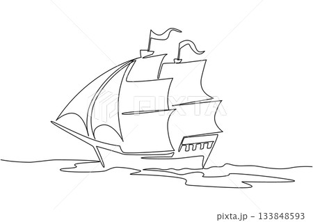 Single continuous line drawing pinisi ship. Traditional boat from South Sulawesi, Indonesia. Has a very unique design. Inter island trade. National Maritime Day. One line design vector illustration
