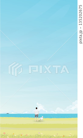 Man with his dog at seashore in summer vector illustration vertical shape. Seascape and blue sky flat design background.