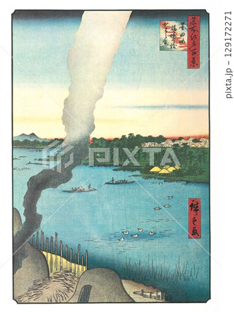 歌川廣重《江戶百景》(春段)#37、隅田川、橋場之渡、河原灶戶