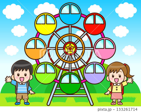 遊樂園裡孩子們在摩天輪上玩耍的插畫素材