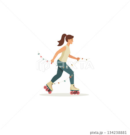 Roller skating woman with festive garland showcasing freedom and fun outdoor activity with bright