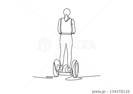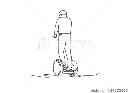Single continuous line drawing man wearing helmet, viewed from behind, riding Segway-style personal transporter. Depicts efficient and unique movement. One line draw graphic design vector illustration
