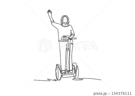 Single continuous line drawing woman standing on Segway style personal transporter and raising one hand in wave. Fun, easy, futuristic micro mobility. One line draw graphic design vector illustration