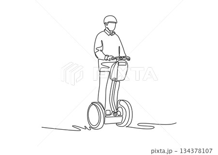 Single continuous line drawing man wearing helmet and jacket, standing on Segway-style transporter. Efficient personal transport in urban environments. One line draw graphic design vector illustration