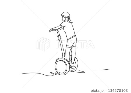 Single continuous line drawing woman in shorts and helmet, viewed from behind, riding Segway-style personal transporter. Focuses on safe and energetic. One line draw graphic design vector illustration
