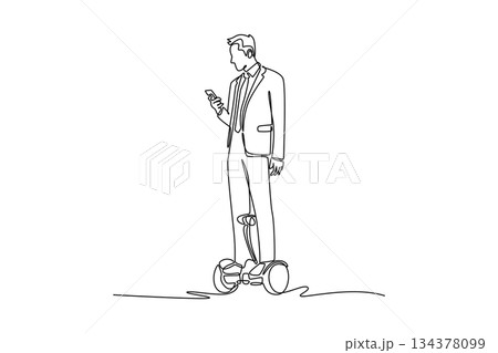 Continuous one line drawing young man in business suit riding hoverboard while checking his smartphone. Depicts efficient, tech-savvy professional. Single line draw design vector graphic illustration