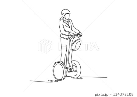 Single continuous line drawing woman wearing helmet and blazer standing on self personal transporter or Segway. Micro-mobility for short urban journey. One line draw graphic design vector illustration